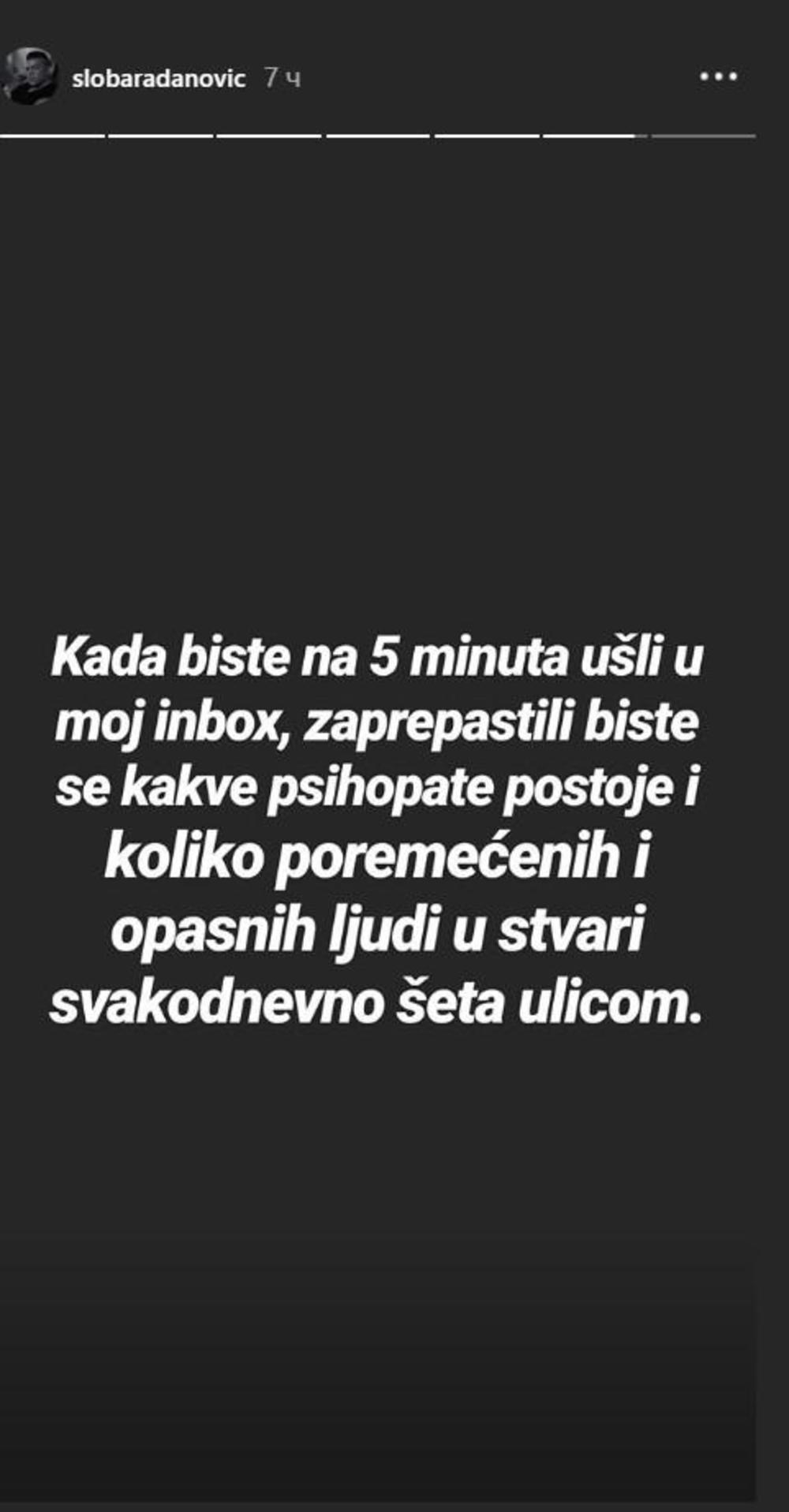 - Kada biste na 5 minuta ušli u moj Inboks, zaprepastili biste se kakve psihopate postoje i koliko poremećenih i opasnih ljudi u stvari svakodnevno šeta ulicom - napisao je Radanović.