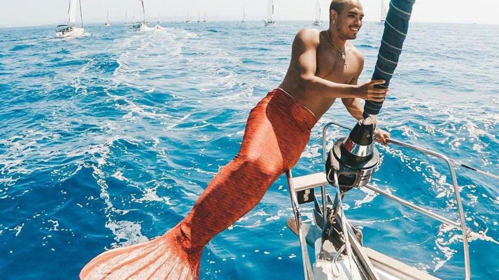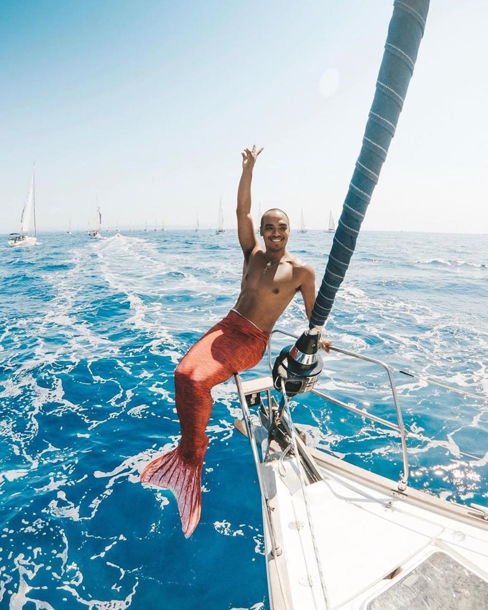 Na sebe je navukao elastični materijal s perajima u obliku repa i seo na ogradu pramca jedrilice.