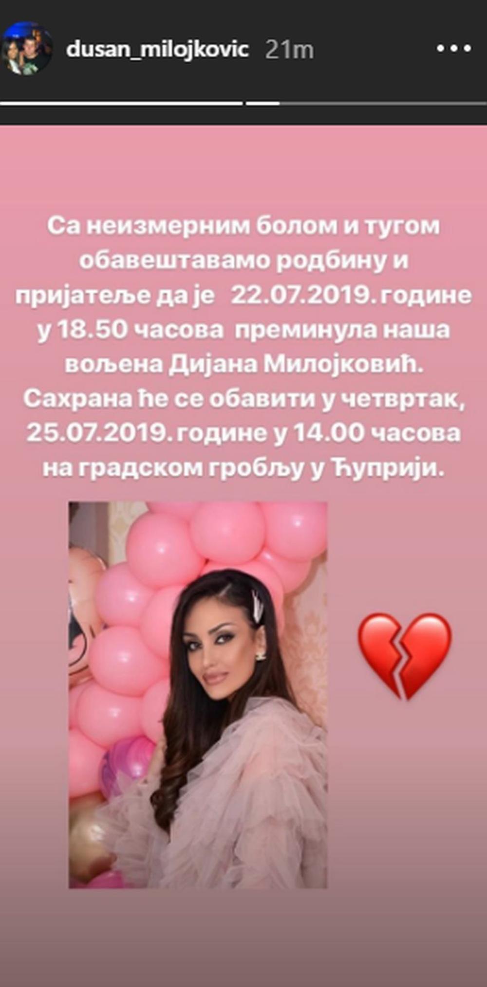 - Sa neizmernim bolom i tugom obaveštavamo rodbinu i prijatelje da je 22. jula 2019. godine u 18:50 časova preminula naša voljena Dijana Milojković. Sahrana će se obaviti u četvrtak, 25. jula 2019. godine u 14 časova na gradskom groblju u Ćupriji - podelio je njen brat Dušan Milojković.