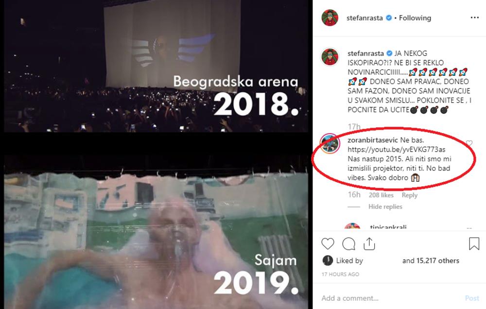 Naime, Rasta je na svom Instagram nalogu objavio fotografiju sa svog koncerta u Beogradskoj areni održanog krajem 2018. godine, kao i Karleušinog nastupa na nedavno održanom festivalu Ulaz, za čije potrebe je koristila projektor.