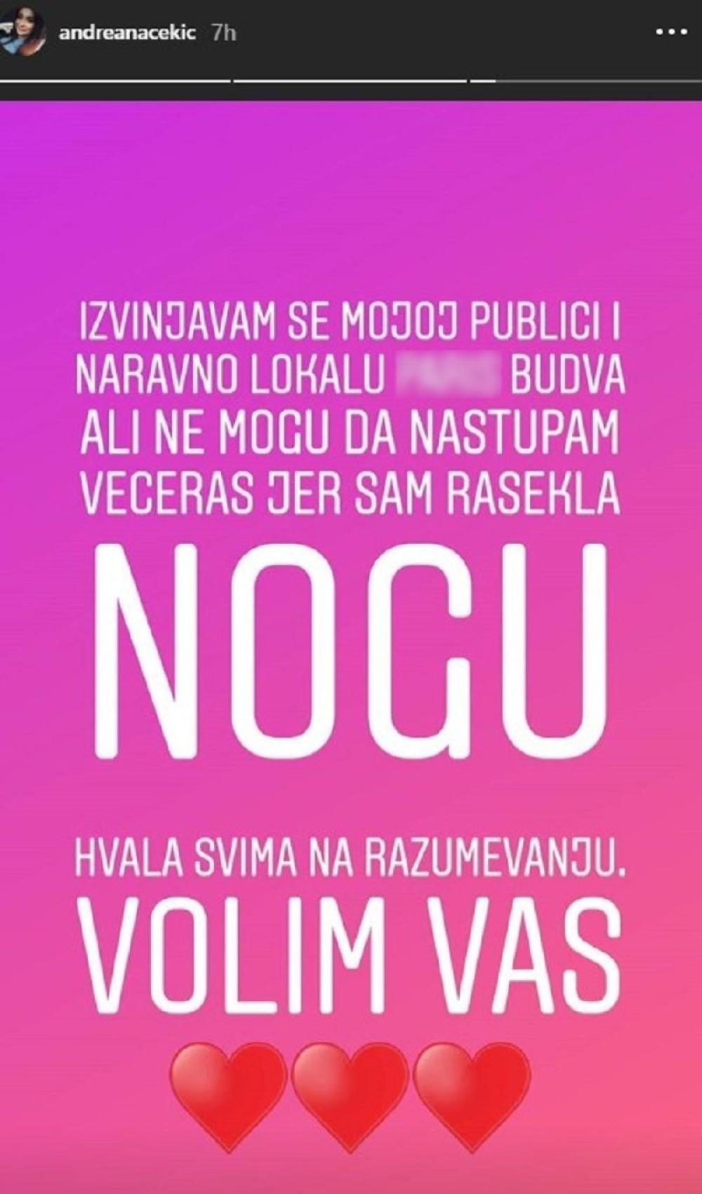 "Izvinjavam se mojoj publici i naravno lokalu u Budvi, ali ne mogu da nastupam večeras jer sam rasekla nogu. Hvala svima na razumevanju, volim vas", napisala je ona.