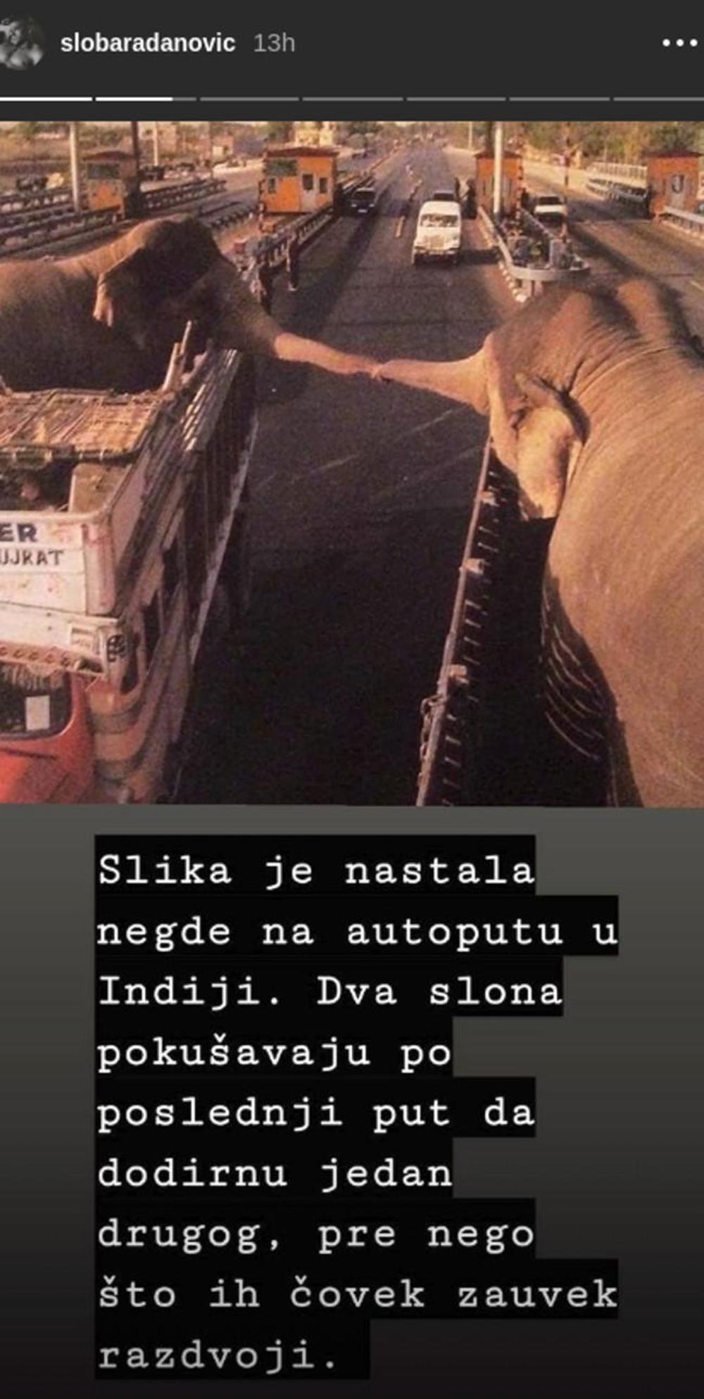 - Slika je nastala negde na autoputu u Indiji. Dva slona pokušavaju da poslednji put dodinu jedan drugog, pre nego što ih čovek zauvek razdvoji - napisao je Sloba u okviru svog storija, a ovom dirljivom objavom rasplakao je mnoge.