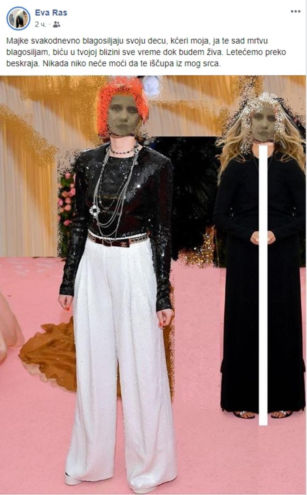 - Majke svakodnevno blagosiljaju svoju decu, kćeri moja, ja te sad mrtvu blagosiljam, biću u tvojoj blizini sve vreme dok budem živa. Letećemo preko beskraja. Nikada niko neće moći da te iščupa iz mog srca. Mogla si da dotakneš nebo svojim talentom, visprenošću i harizmom. Ali nije ti se dalo. Izabrala si krivo nebo i pogrešnu sreću, zato te sada ovde sahranjujemo. Za tugu i bol ne postoji rok trajanja, bol najjače boli kada suze usahnu. Želim da umrem i da mi je grob u tvojim očima. Neka ti je laka zemlja, kćeri moja lepa - piše u Evinoj objavi.