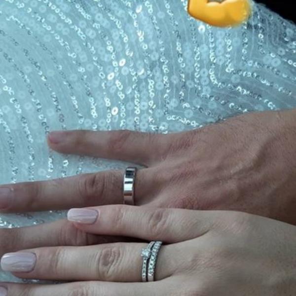 Pevačica, koja je pre nekoliko godina napustila estradu kako bi završila medicinski fakultet, odabrala je elegantnu belu venčanicu sa šljokicama koja joj je istakla dekolte, dok je njen suprug obukao crno odelo sa belom košuljom.