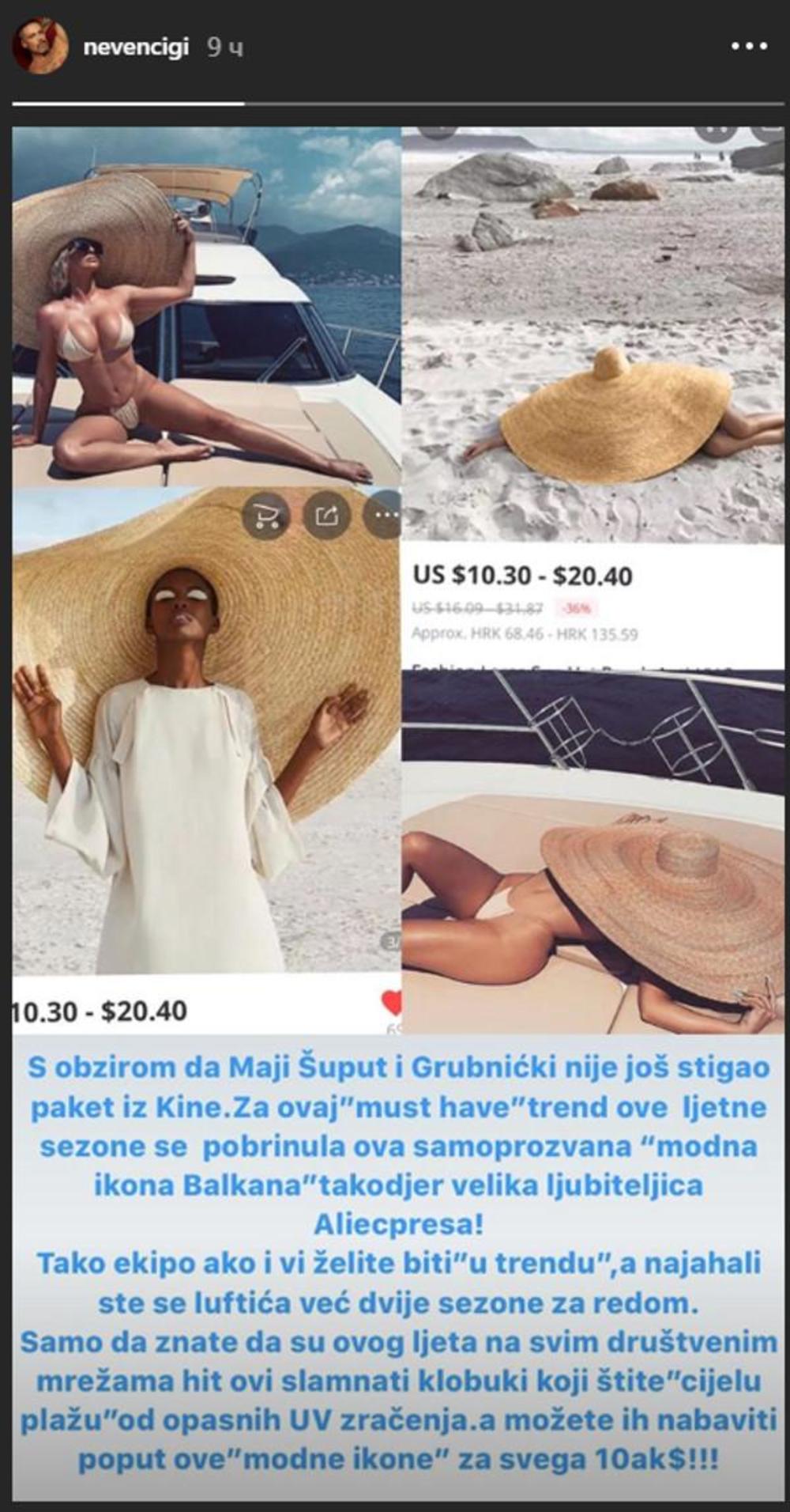 "Za ovaj "must have" trend ove letnje sezone se pobrinula ova samoprozvana “Modna Ikona Balkana” takođe velika ljubiteljka Aliexpresa! Tako ekipa, ako i vi želite da budete "u trendu", a najahali ste se luftića već dve sezone za redom. Samo da znate da su ovog leta na svim društvenim mrežama hit ovi slamnati klobuci koji štite "celu plažu" od opasnih UV zračenja. A možete ih nabaviti poput ove "Modne Ikone" za svega 10-ak dolara!"