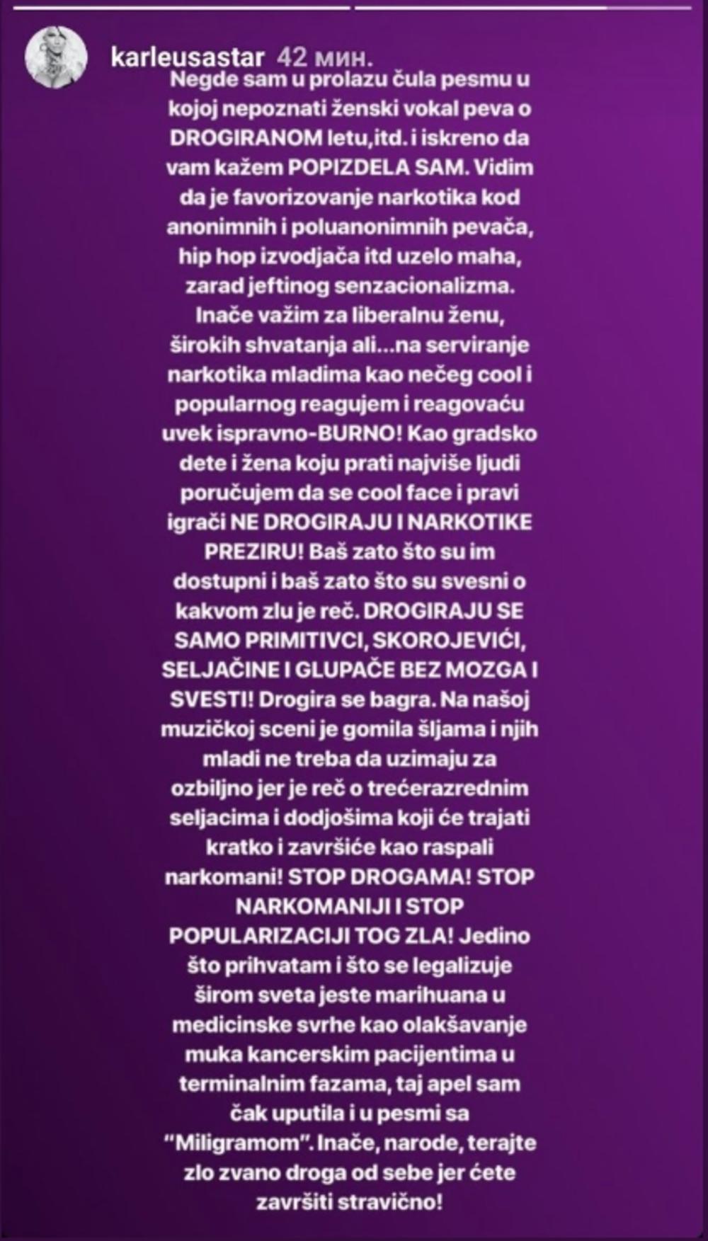 - Drogiraju se samo primitivci, skorojevići, seljačine i glupače bez mozga svesti! Drogira se bagra. Na našoj muzičkoj sceni je gomila šljama i njih mladi ne treba da uzimaju za ozbiljno jer je reč o trećerazrednim seljacima i dođošima koji će trajati kratko i završiće kao raspali narkomani! Stop drogama! Stop narkomaniji i stop popularizaciji tog zla! Jedino što prihvatam i što se legalizuje širom sveta jeste marihuana u medicinske svrhe, kao olakšavanje muka kancerskim pacijentima u terminalnim fazama, taj apel sam čak uputila i u pesmi sa Miligramom. Inače, narode, terajte zlo zvano droga od sebe jer ćete završiti stravično! - poručila je za kraj.