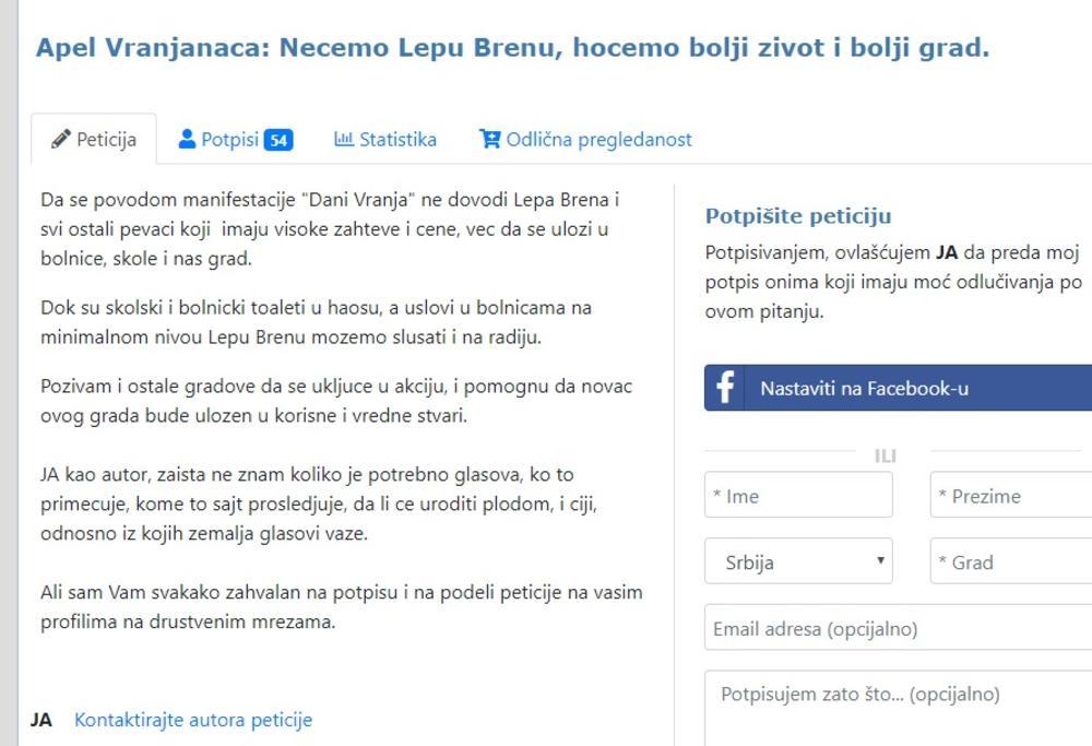 - Da se povodom manifestacije Dani Vranja ne dovodi Lepa Brena i svi ostali pevači koji imaju visoke zahteve i cene, već da se uloži u bolnice, škole i naš grad. Dok su školski i bolnički toaleti u haosu, a uslovi u bolnicama na minimalnom nivou, Lepu Brenu možemo slušati i na radiju. Pozivam i ostale gradove da se uključe u akciju i pomognu da novac ovog grada bude uložen u korisne i vredne stvari. Ja kao autor zaista ne znam koliko je potrebno glasova, ko to primećuje, kome to sajt prosleđuje, da li će uroditi plodom, i čiji, odnosno iz kojih zemalja glasovi važe. Ali sam vam svakako zahvalan na potpisu i na podeli peticije na vašim profilima na društvenim mrežama - piše u zahtevu neimenovanog autora.