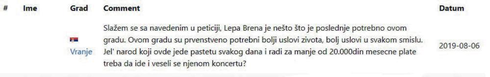 - Slažem se s navedenim u peticiji. Lepa Brena je nešto što je poslednje potrebno ovom gradu. Ovom gradu su prvenstveno potrebni bolji uslovi života, bolji uslovi u svakom smislu. Je l' narod koji ovde jede paštetu svakog dana i radi za manje od 20.000 dinara mesečne plate treba da ide i veseli se njenom koncertu? - pita se jedan potpisnik.