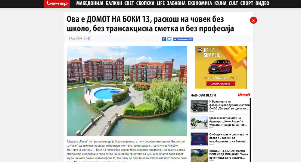 Makedonski mediji objavili su fotografije raskošnog doma u kojem je živeo Boki 13 i postavljaju pitanje kako je moguće da državni organi nisu primetili ovaj luksuz bez legalnog pokrića. Kako navode, Boki 13 nije imao ni završenu školu, ni zanimanje, niti račun u banci. Fotografije otkrivaju da je kontroverzni voditelj živeo na visokoj nozi i podsećaju da je u njegovu kuću dolazila i specijalna tužiteljka Katica Janeva, koja tek treba da da iskaz o svojoj ulozi u ovoj aferi. Kako je objavio portal Vecer.mk, luksuzni stan Bokija 13 nalazi se u kompleksu u skopskom Volkovu, u kojem živi makedonska elita.