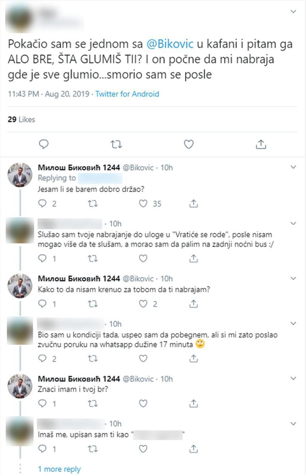 - Pokačio sam se jednom sa Bikovićem u kafani i pitam ga ALO, BRE, ŠTA GLUMIŠ TI? I on počne da mi nabraja gde je sve glumio... Smorio sam se posle - napisao je korisnik Tvitera, a onda mu je Miloš odgovorio, i to pitanje:
