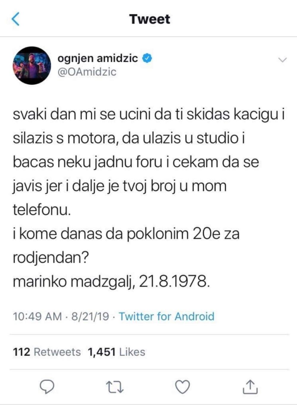 Svaki dan mi se učini da ti skidaš kacigu i silaziš s motora, da ulaziš u studio i bacaš neku jadnu foru i čekam da se javiš jer i dalje je tvoj broj u mom telefonu. I kome danas da poklonim 20 evra za rođendan?