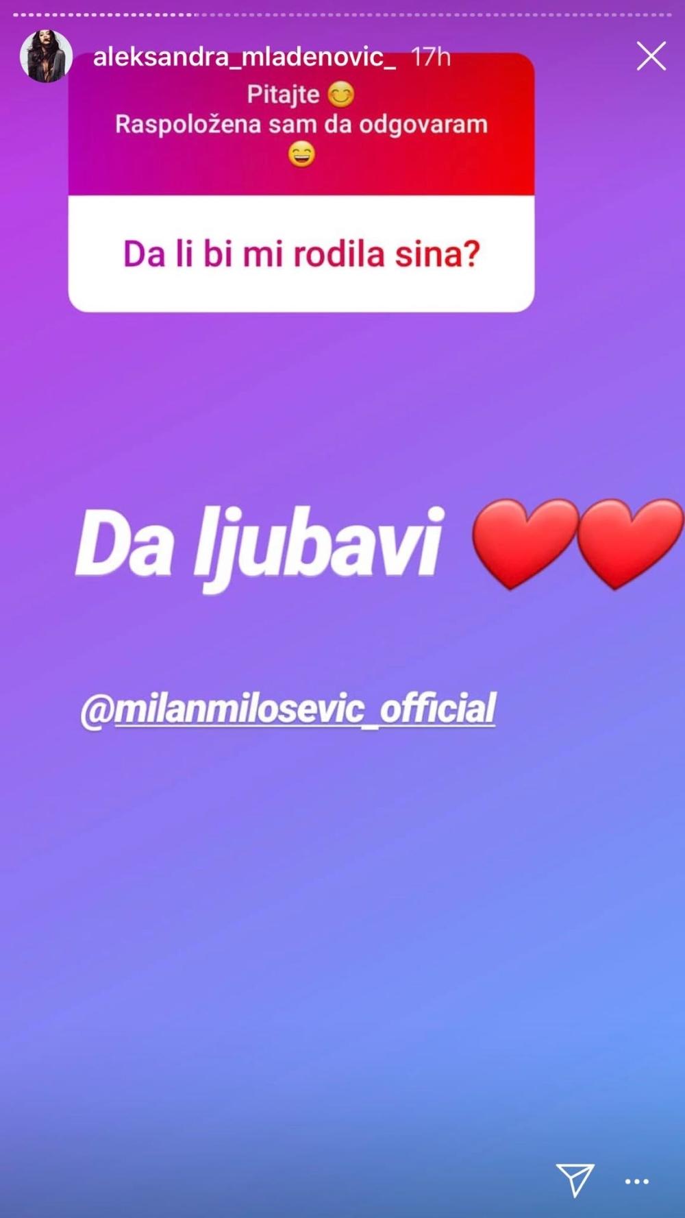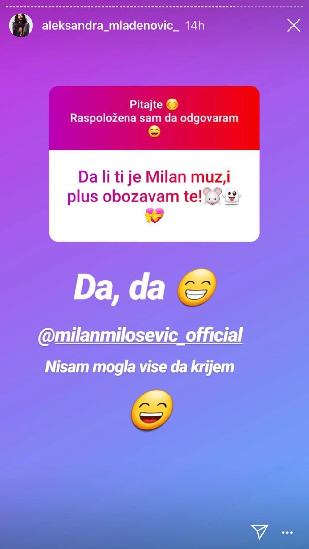 "Da li ti je Milan muž, i plus obožavam te", napisao joj je jedan od fanova, a Aleksandra je brzo odgovorila: