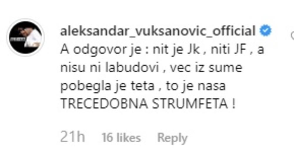 - Nego, moj Andrej gleda Instagram i pita me: "Ćale, je l' ovo JK? Ne zna on! A u trenutku se učinilo i meni. Pa rekoh da pitam. Mislim da nije ni jedno ni drugo! A odgovor je: "Nit je JK, niti JF, a nisu ni labudovi, već iz šume pobegla je teta, to je naša trećedobna Štrumpfeta! - napisao je revoltirani Aca.