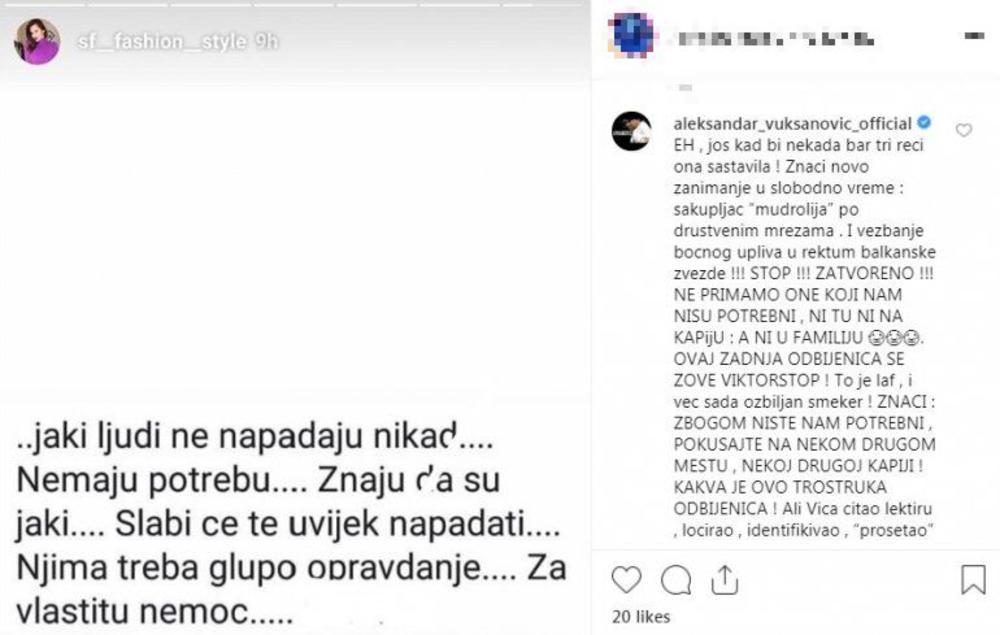 "Jaki ljudi ne napadaju nikada, nemaju potrebu, znaju da su jaki. Slabi će uvek napadati, njima treba glupo opravdanje za vlastitu nemoć", objavila je Sonja nečiji citat, koji je Lukas prokomentarisao.