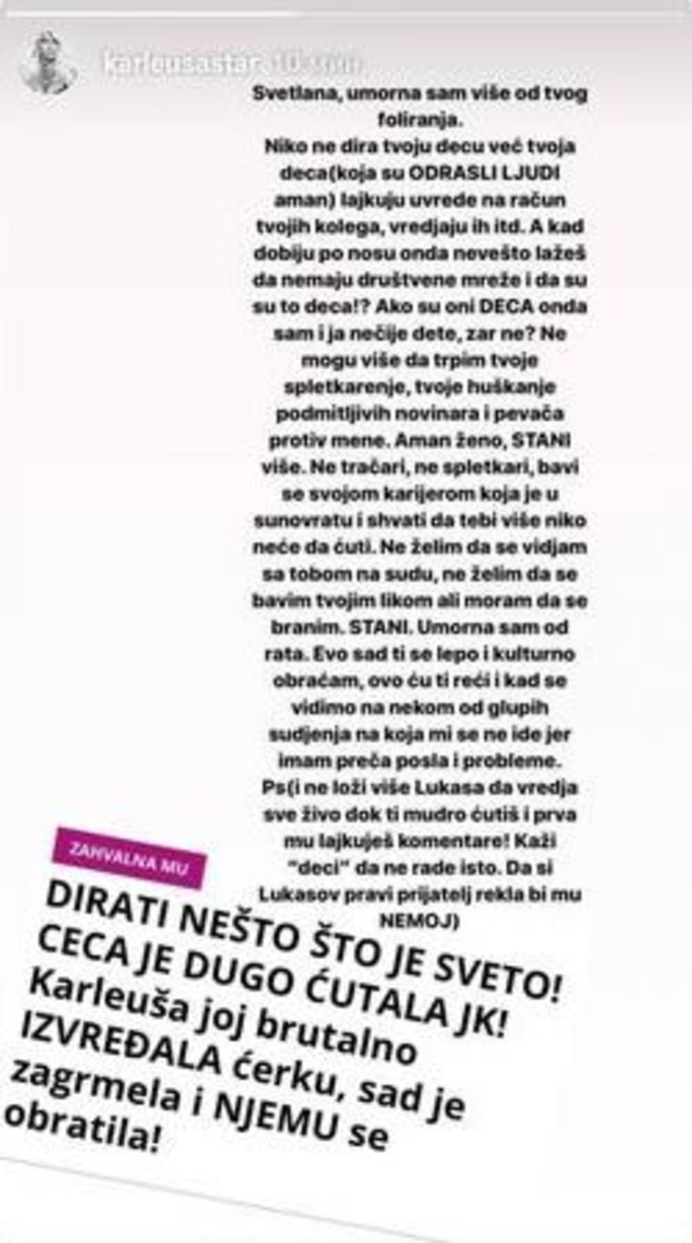 "Svetlana, umorna sam više od tvog foliranja. Niko ne dira tvoju decu, (jer su odrasli ljudi, aman) lajkuju uvrede na račun tvojih kolega, vređaju ih, a kada dobiju po nosu, onda nevešto lažeš da oni nemaju mreže i da su to deca. Ako su deca, onda sam i ja nečije dete? Ne mogu više da trpim tvoje spletkarenje, huškanje. Aman ženo, stani. Ne tračari, ne spletkari, bavi se svojom karijerom, koja je u sunovratu. Ne želim da se više viđam sa tobom na sudu, ne želim da se bavim tvojim likom, ali moram da se branim. A sada lepo i kulturno, ovo ću ti reći kada se vidimo na jednom od glupih suđenja. Ps: Ne loži više Lukasa da vređa sve živo dok ti mudro ćutiš i prva mu lajkuješ komentare. Da si Lukasov pravi prijatelj rekla bi mu isto", napisala je pevačica na svom Instagram storiju.