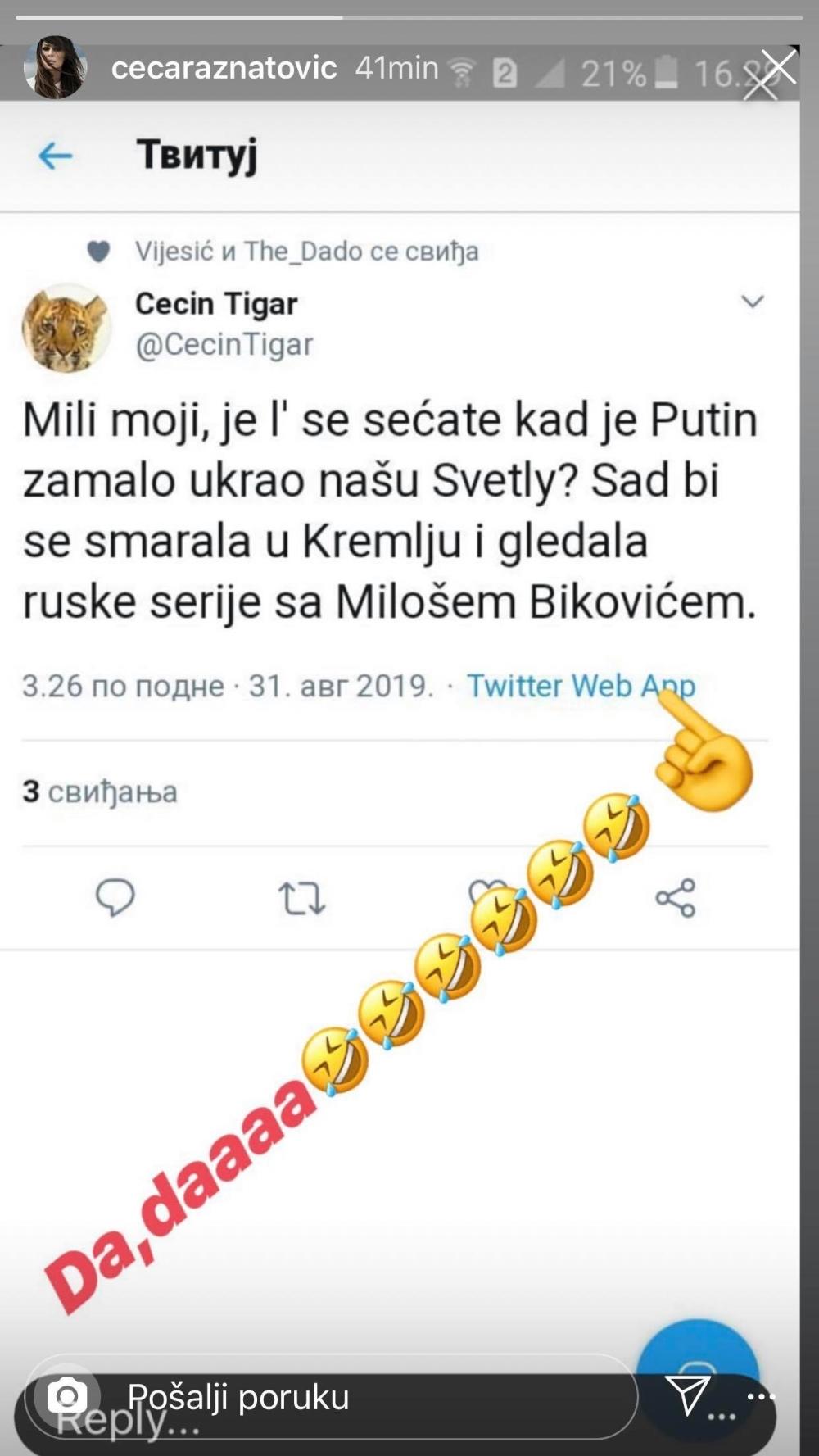 Očigledno je ova šala toliko zasmejala i pevačicu, da nije mogla da odoli, a da je ne objavi na svom Insta storiju.
