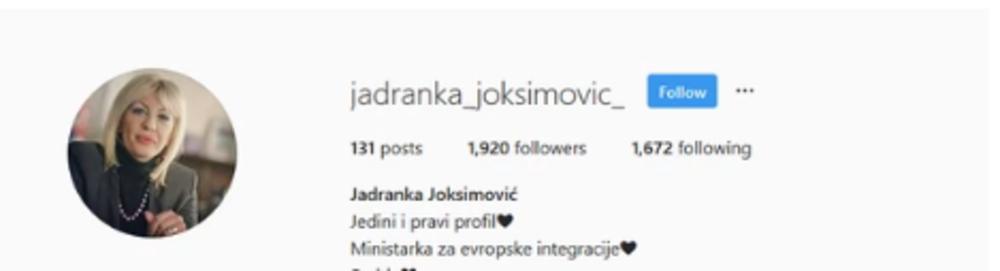 Na profilu ministarke Jadranke Joksimović stoji da je to "jedini i pravi profil".
