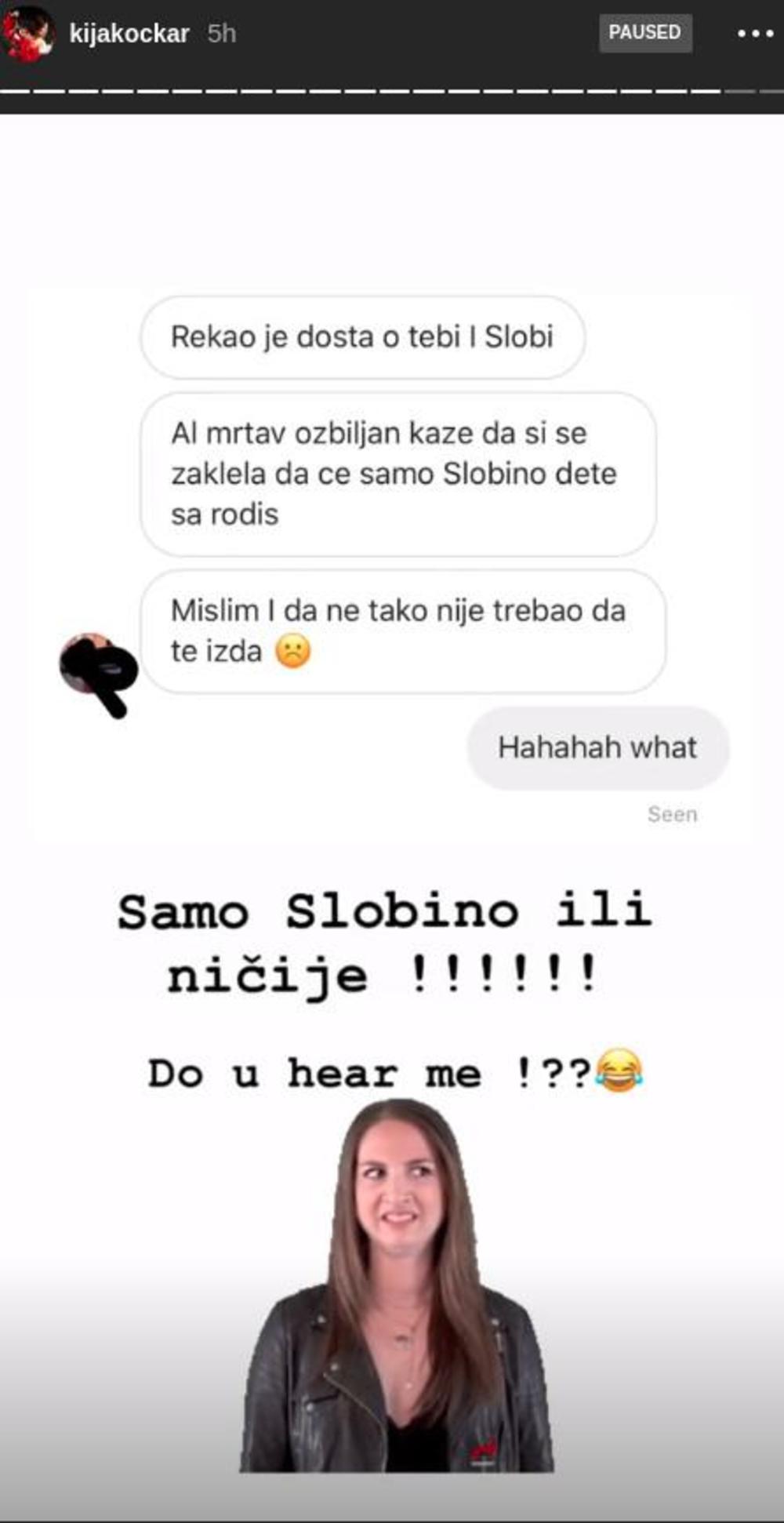 Iako Kija tvrdi da sa bivšim ne komunicira, opet je morala da objavi jednu prepisku u kojoj su njih dvoje glavni akteri. Nije otkrila sa kim se dopisivala, ali joj taj neko preneo da je čuo kako se ona zaklela da će roditi samo Slobino dete i ničije više: