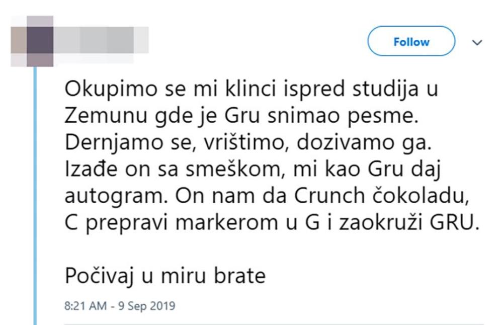 - Okupimo se mi klinci ispred studija u Zemunu gde je Gru snimao pesme. Dernjamo se, vrištimo, dozivamo ga. Izađe on sa smeškom, mi kao: "Gru daj autogram". On nam da Crunch čokoladu, C prepravi markerom u G i zaokruži GRU. Počivaj u miru brate - napisao je jedan reperov fan na društvenim mrežama.