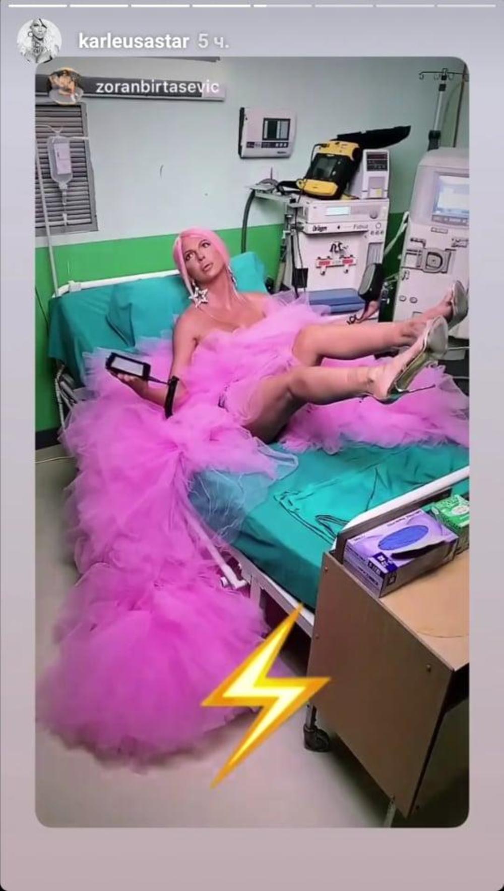 Ipak, nismo mogli, a da ne primetimo i drugi stori na kojem se vidi diva kako leži na krevetu za reanimaciji u haljini od roze tila, dok pokušava da reanimira sebe elektrošokovima ili stručno defibrilacijom.