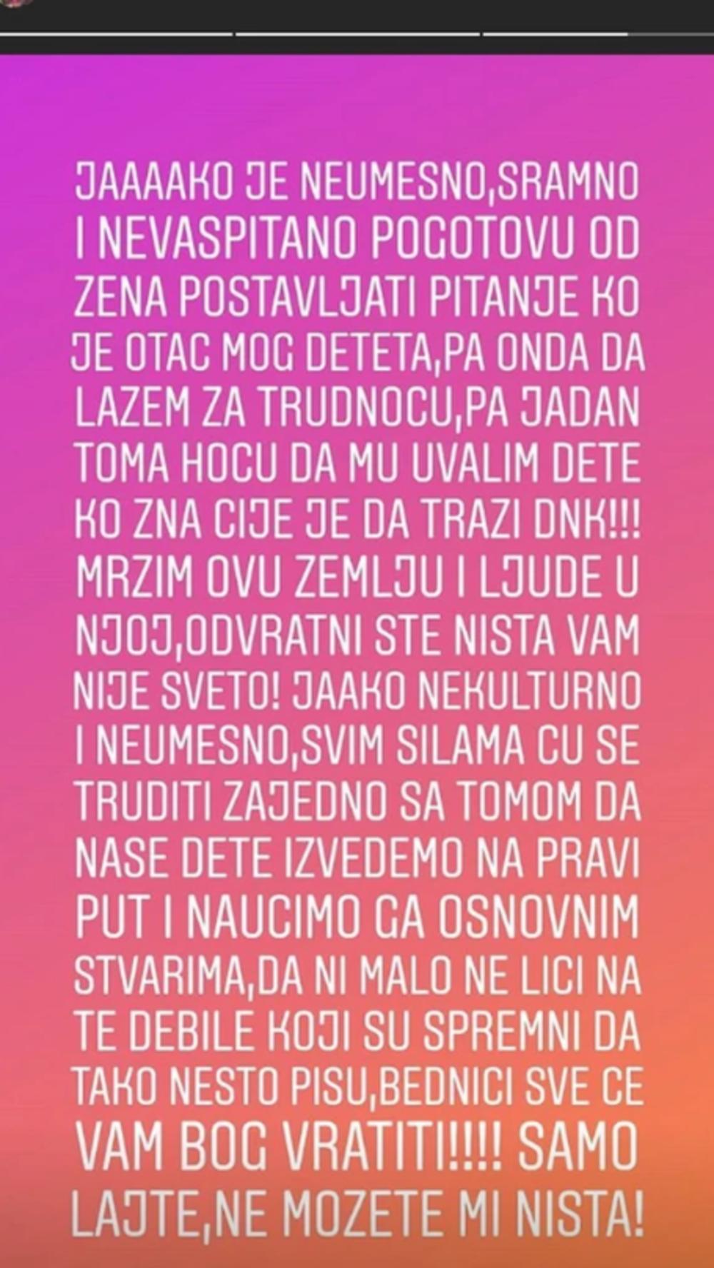 - Mrzim ovu zemlju i ljude u njoj, odvratni ste, ništa vam nije sveto! Jako nekulturno i neumesno, svim silama ću se truditi zajedno sa Tomom da naše dete izvedemo na pravi put i naučimo ga osnovnim stvarima, da ni malo ne liči na te debile koji su spremni da tako nešto pišu. Bednic. Samo lajte, ne možete mi ništa! - poručila je Nadežda.