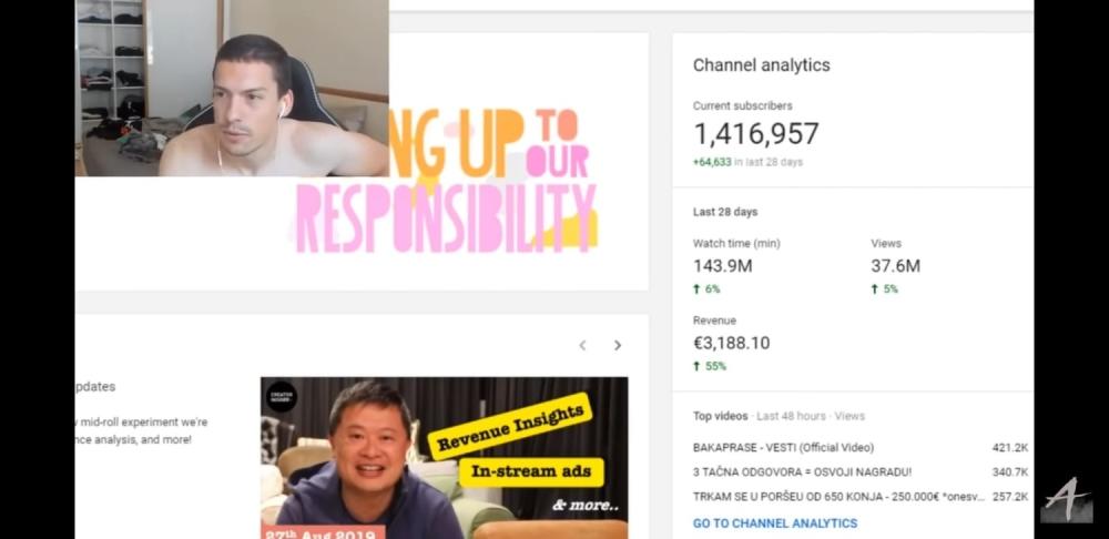 Takođe on je istakao da je to samo deo novca koji zarađuje. Ovo je samo od pregleda na YT, na to se nadovezuje njegov fastfud, modna marka, intagram reklame... Primera radi, jedna objava na storiju popularnih domaćih Jutjubera nije ispod 500 evra, a o pojavljivanjima na događajima, promocijama, te većim reklamnim kampanjama da ne govorimo.