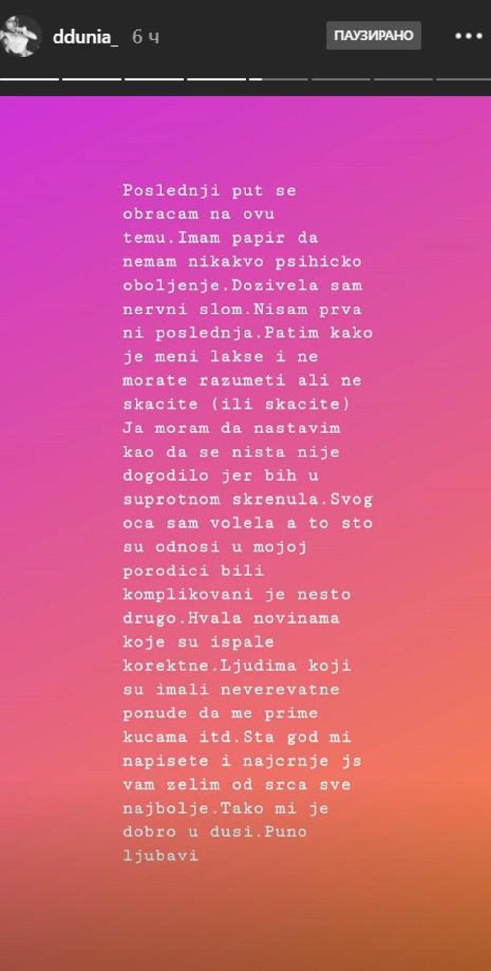 Poslednji put se obraćam na ovu temu. Imam papir da nemam nikakvo psihičko oboljenje. Doživela sam nervni slom. Nisam prva ni poslednja. Patim kako je meni lakše i ne morate razumeti, ali ne skačite (ili skačite). Ja moram da nastavim kao da se ništa nije dogodilo, jer bih u suprotnom skrenula. Svog oca sam volela, a to što su odnosi u mojoj porodici bili komplikovani je nešto drugo. Hvala novinama koje su ispale korektne. Ljudima koji su imali neverovatne ponude da me prime kućama itd. Šta god mi napišete i najcrnje, ja vam želim od srca sve najbolje. Tako mi je dobro u duši. Puno ljubavi", napisala je Dunja.