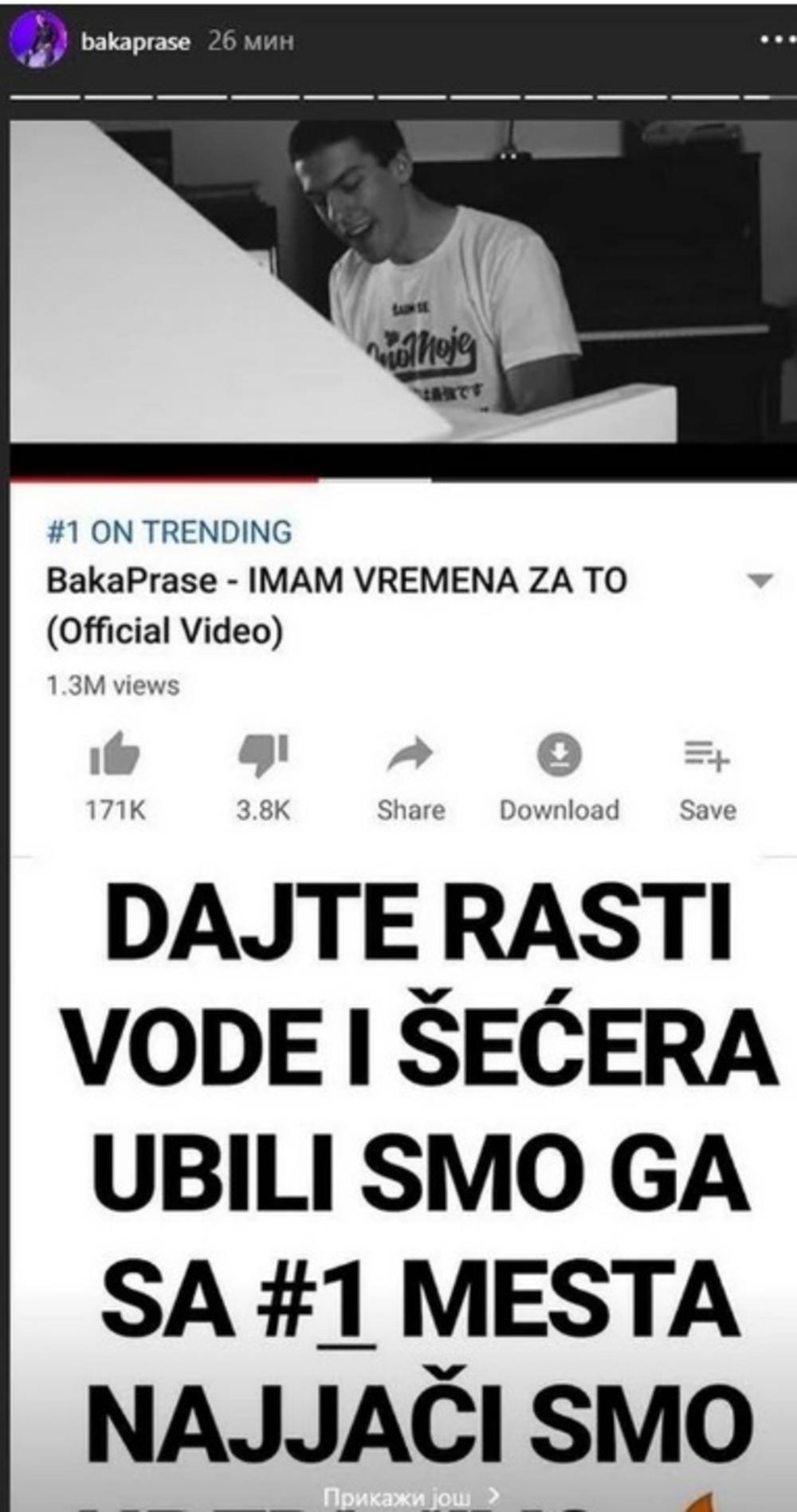 Naime, Baka Prase je objavio pesmu posvećenu pevačici Sari Jo koja je za samo dva dana dospela na prvo mesto u "trendingu", čime je Baka Prase sa tog mesta skinuo repera Rastu i njegovu novu pesmu "Kombi".