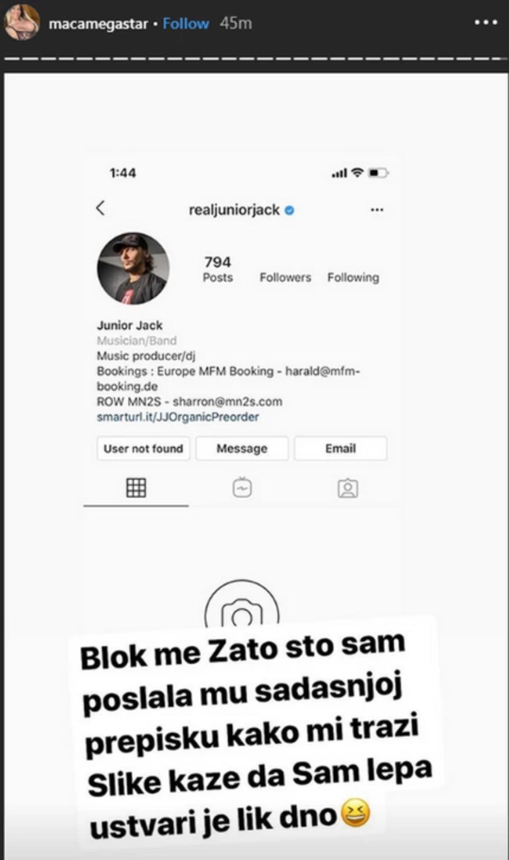 Starleta Maca Diskrecija dopisivala se sa di-džejem Džuniorom Džekom, bivšim mužem Kaje Ostojić, a hit prepisku, nakon koje ju je on blokirao na Instagramu, objavila je na ovoj društvenoj mreži.