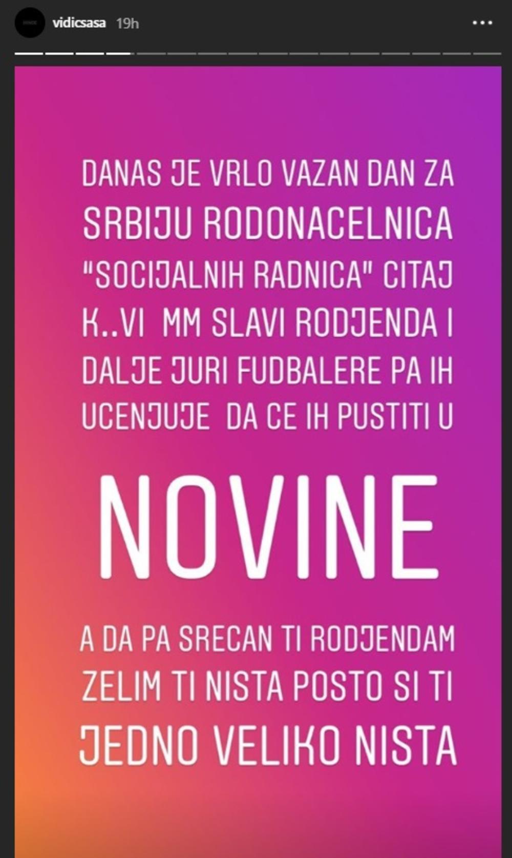 - Danas je vrlo važan dan za Srbiju! Rodonačelnica "socijalnih radnica", čitaj ku**i slavi rođendan i idalje juri fudbalere pa ih ucenjuje da će ih pustiti u novine. A da, pa srećan ti rođendan, želim ti NIŠTA pošto si ti jedno veliko NIŠTA - napisao je Saša.