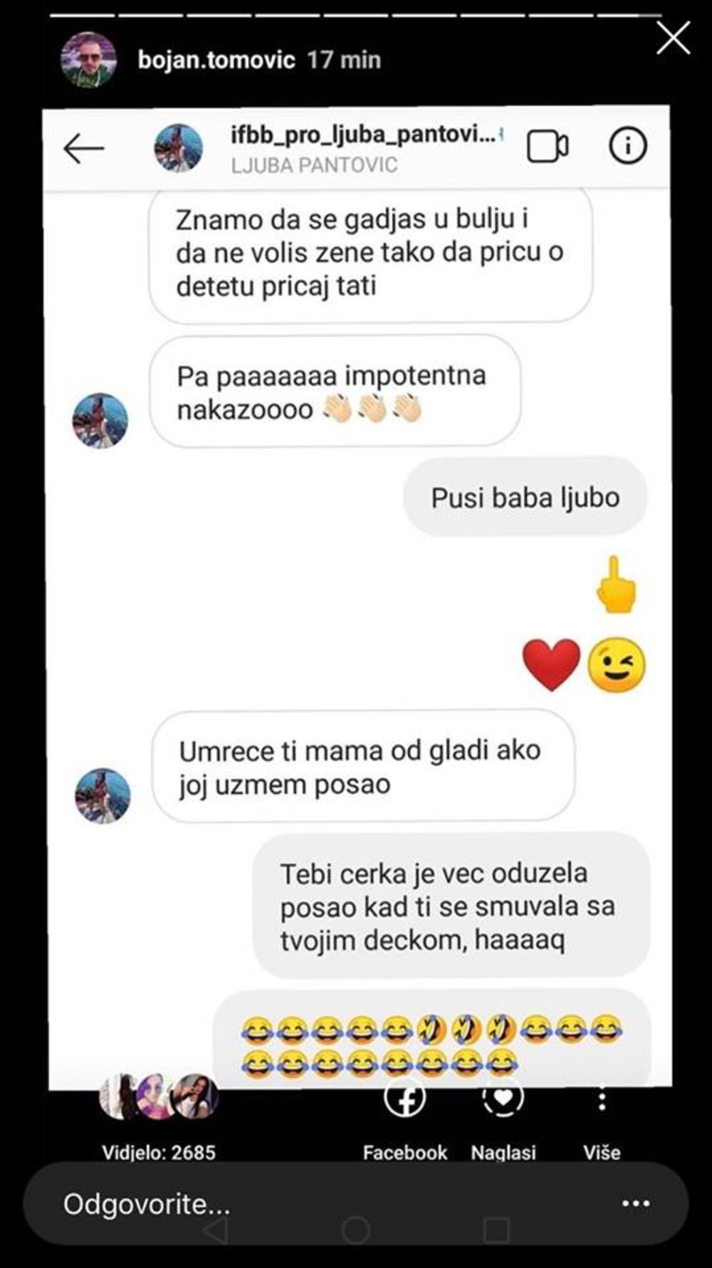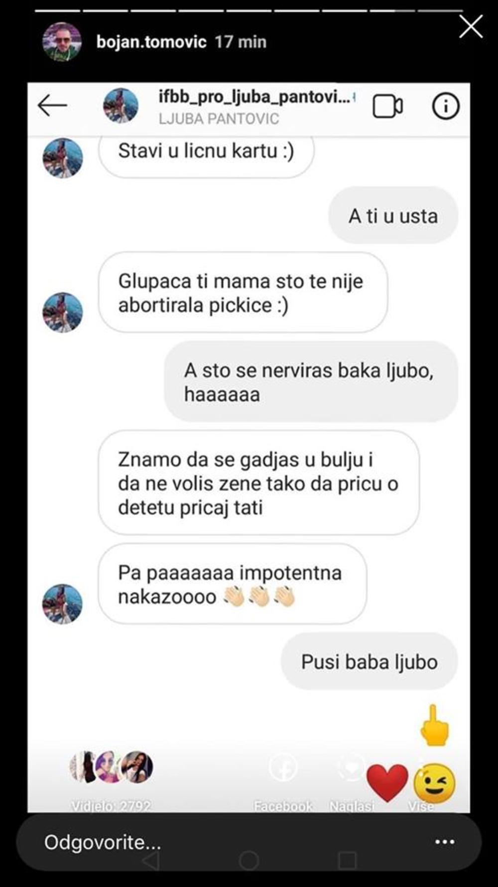 Poznati pevač Bojan Tomović (37) i fitnes instruktorka i rijaliti učesnica Ljuba Pantović (41) su izvređali jedno drugo putem društvenih mreža, a sve je počelo tako što je Ljuba prva prozvala Tomovića, koji traži honorar od 2500 evra nedjeljno da bi ušao u rijaliti "Zadruga", na šta je Pantovićeva objavila: