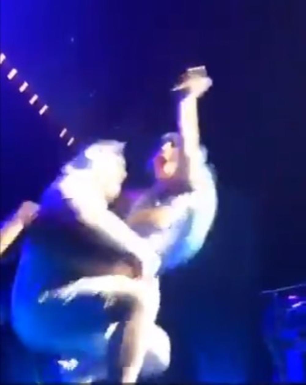 Da li od uzbuđenja i šoka ili zbog nečeg drugog, fan je izgubio ravnotežu, te se sa sve pevačicom u rukama stropoštao niz binu.