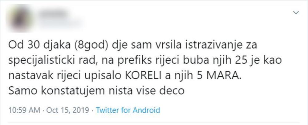 - Od 30 učenika (8 godina) gde sam vršila istraživanje za specijalistički rad, na prefiks reči buba njih 25 je kao nastavak reči upisalo Koreli a njih 5 mara. Samo konstatujem, ništa više deco - napisala je tviterašica.