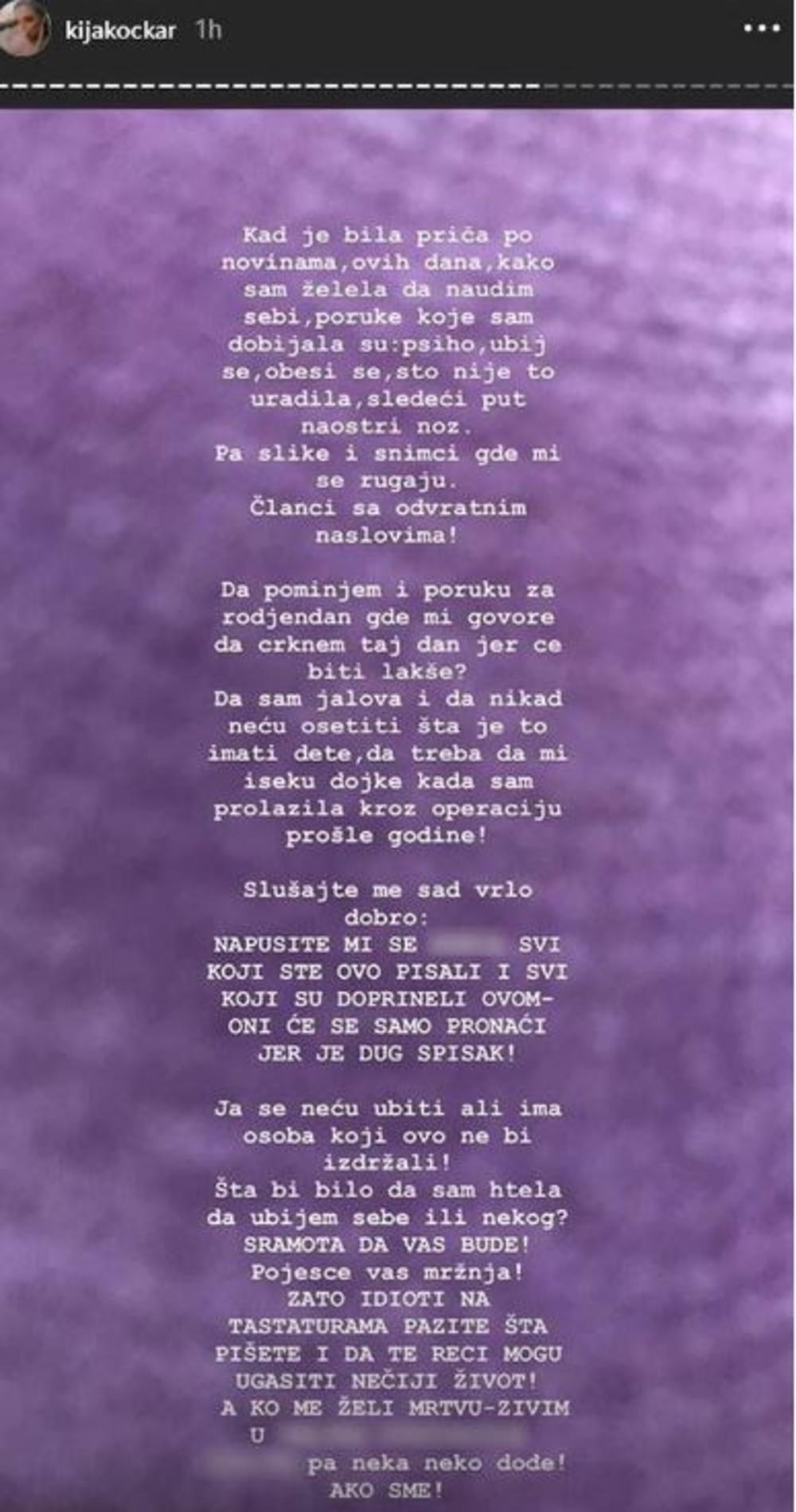 Kad je bila priča po novinama ovih dana kako sam želela da naudim sebi, poruke koje sam dobijala su "psiho", "ubij se", "obesi se", "što nije to uradila", "sledeći put naoštri nož". Pa slike i snimci gde mi se rugaju. Članci sa odrvatnim naslovima. Da pominjem i poruku za rođendan, gde mi pominju da crknem taj dan, jer će mi biti lakše. Da sam jalova i da nikad neću osetiti šta je to imati dete, da treba da mi iseku dojke kada sam prolazila kroz operaciju prošle godine", napisala je ona i pokušala da pošalje poruku da nisu svi snažni kao ona i da može da se desi da neko neće moći da podnese takve stravične pretnje.