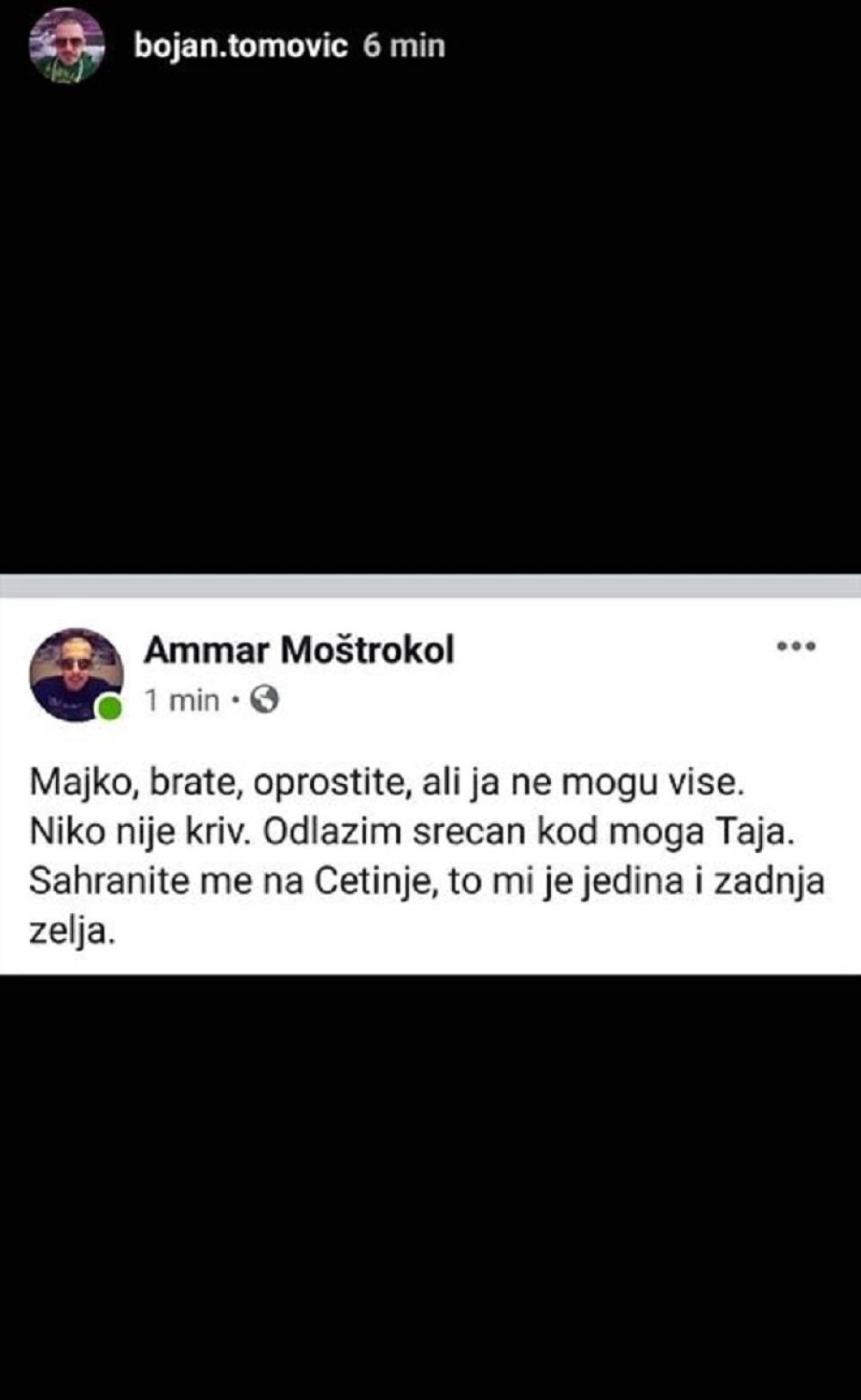 - Majko, brate, oprostite, ali ja ne mogu više. Niko nije kriv. Odlazim srećan kod mog Taja. Sahranite me na Cetinje, to mi je jedina i zadnja želja - napisao je Tomović.