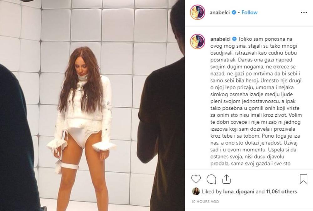 "Toliko sam ponosna na ovog mog sina, stajali su tako mnogi osuđivali, istraživali, kao čudnu bubu posmatrali. Danas ona gazi napred svojim dugim nogama, ne okrece se nazad, ne gazi po mrtvima da bi sebi i samo sebi bila heroj. Umesto nje drugi o njoj lepo pričaju, umorna i nejaka širokog osmeha izađe među ljude pleni svojom jednostavnošcu, a ipak tako posebna u gomili onih koji vrište za onim što nisu imali kroz život. Volim te dobri čoveče i nije mi žao nijednog izazova koji sam doživela i proživela kroz tebe i sa tobom. Puno toga je iza nas, a ono sto dolazi je radost. Uživaj sad i u ovom momentu. Uspela si da ostanes svoja, nisi dusu đavolu prodala, sama svoj gazda i sve sto radis radis iz čiste ljubavi, materijalno si uvek stavljala na zadnje mesto to si dokazala kroz 2 godine stavljajući sebe na izvolite. Sada živis svoje snove čiste kao suza dečija, a onima koji su tu suzu isprljali neka Bog prašta. Budi svoja, budi luda, jedi, voli, moli Bog je veliki.... voli te tvoja mamica i čuvam ti leđa jer to je moja stvar", napisala je Anabela na Instagramu.