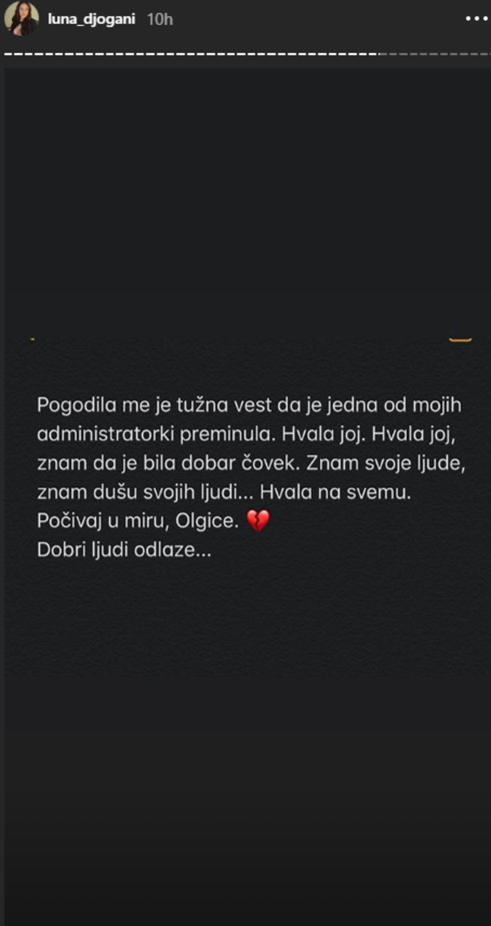 "Administratorka grupe koja je željno iščekivala Luninu pesmu i koja se od prvog dana borila za Lunu koju je volela svim srcem, nažalost jutros je preminula. Olgice naša, neka ti je laka zemlja. Porodici iskreno saučešće. Večna ti slava i hvala!"