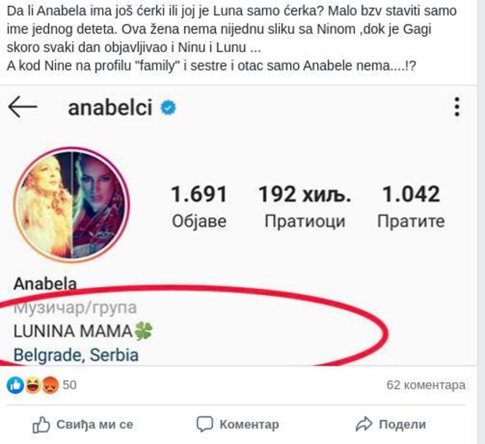 - Da li Anabela ima još ćerki ili joj je Luna samo ćerka? Malo je bez veze samo ime jednog deteta. Ova žena nema sliku sa Ninom, dok je Gagi skoro svaki dan objavljivao i Ninu i Lunu... A kod Nine na profilu "family", sestre i otac samo, Anabele nema - glasio je komentar neobožavateljke, a sve u opisu Anabelinog profila na Instagramu na kojem je ona na mesto zanimanja napisala "Lunina mama".