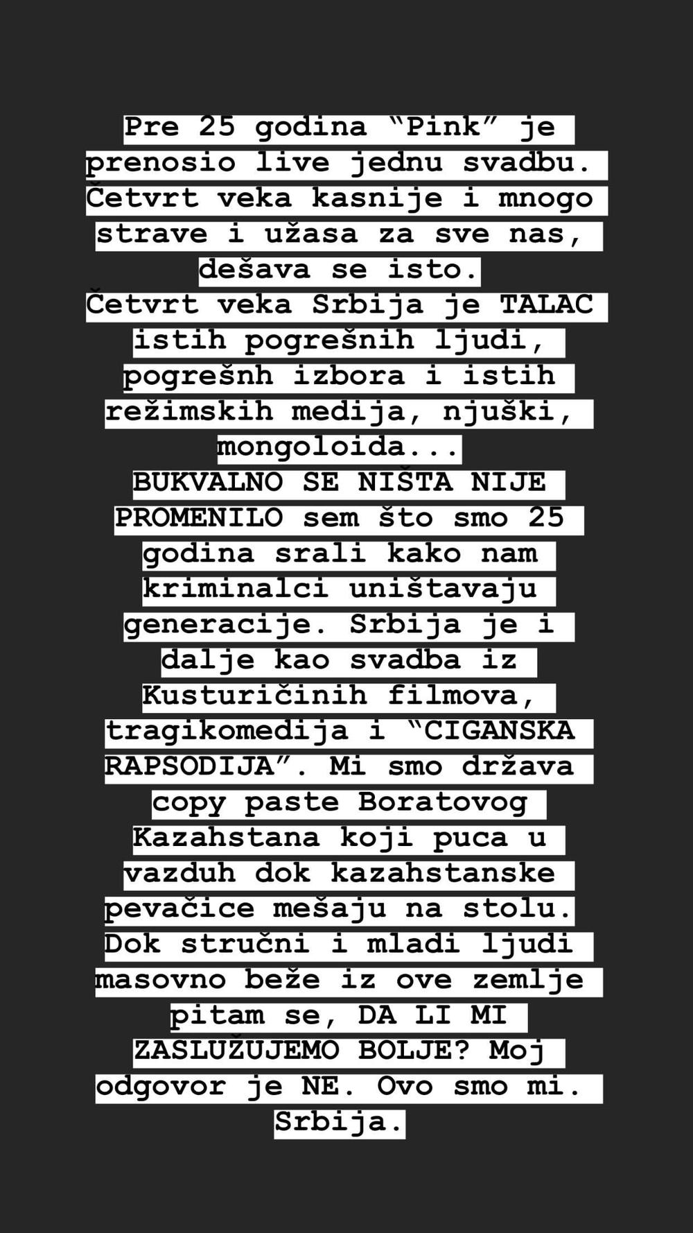 "Pre 25 godina Pink je live prenosio jednu svadbu. Četvrt veka kasnije i mnogo strave i užasa za sve nas, dešava se isto. Četvrt veka Srbija je TALAC istih pogrešnih ljudi, pogrešnih izbora i istih režimskih medija, njuški, mongoloida… BUKVALNO SE NIŠTA NIJE PROMENILO sem što smo 25 godina sje*ali kako nam kriminalci uništavaju generacije. Srbija je i dalje kao svadba iz Kusturičinih filmova, tragikomedija i “Ciganska rapsodija”! Mi smo država Boratovog copy/paste Kazahstana koji puca u vazduh dok kazahtanske pevačice mešaju na stolu. Dok stručni i mladi ljudi beže iz ove zemlje pitam se “da li mi zaslužujemo bolje”? Moj odgovor je ne. Ovo smo mi. Ovo je Srbija", napisala je ona, očigledno zaboravivši na svoje prvo venčanje s Bojanom Karićem, koje je ista televizija pre 15 godina prenosila.