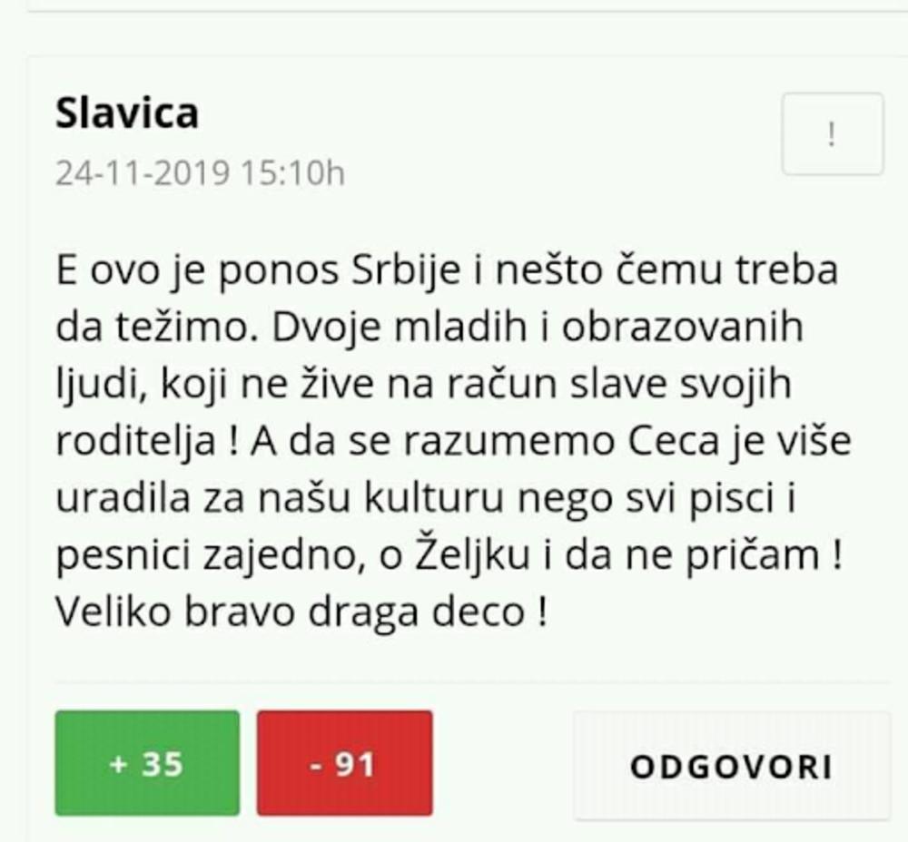 - E ovo je ponos Srbije i nešto čemu treba da težimo. Dvoje mladih i obrazovanih ljudi, koji ne žive na račun slave svojih roditelja! A da se razumemo Ceca je više uradila za našu kulturu nego svi pisci i pesnici zajedno, o Željku da ne pričam! Veliko bravo draga deco - pisalo je u komentaru koji je napisala određena Slavica.