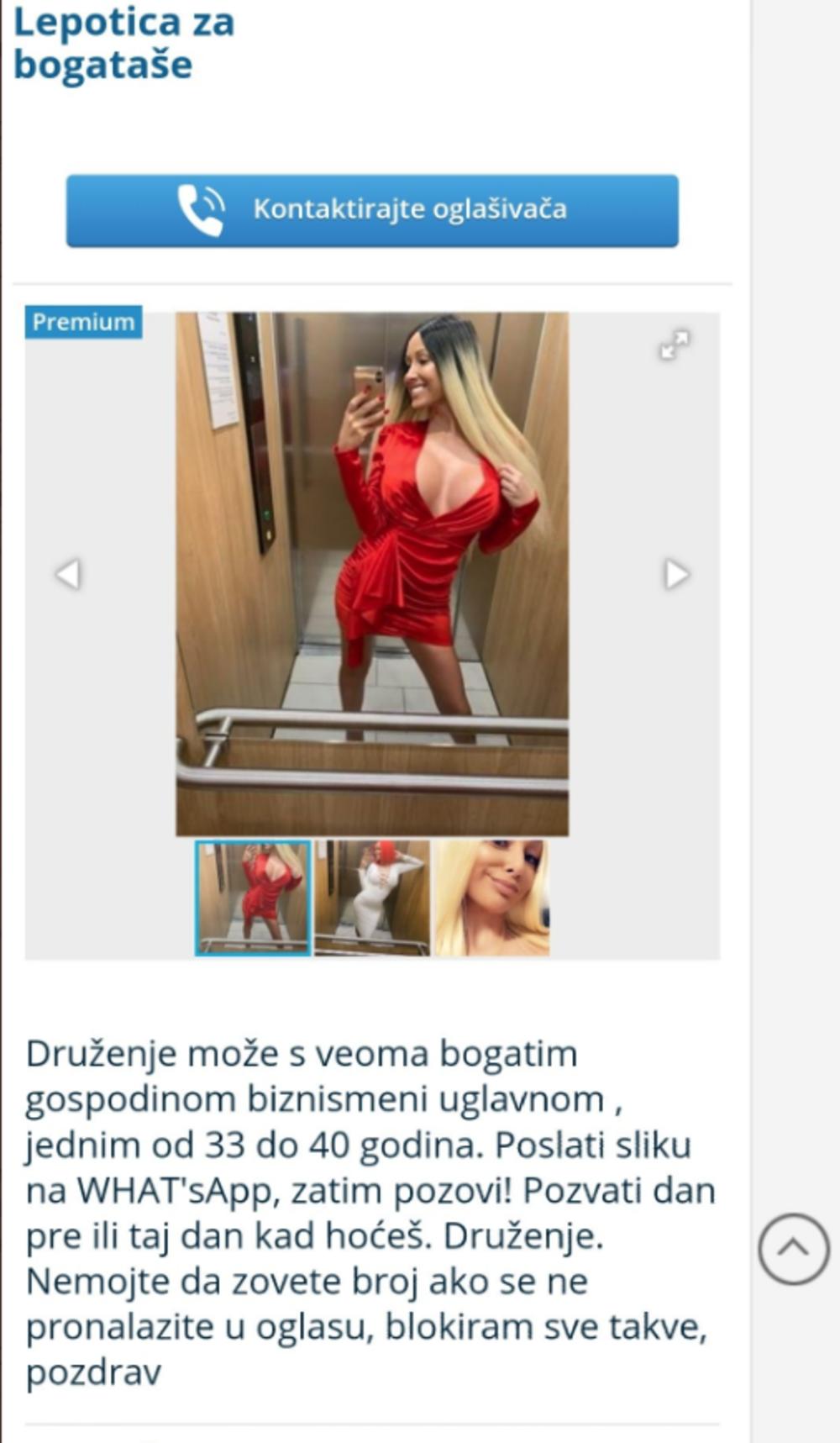 "Druženje može s veoma bogatim gospodinom, biznismeni uglavnom, jednim od 33 do 40 godina. Poslati sliku na WhatsApp, zatim pozovi. Pozvati dan pre ili taj dan kad hoćeš. Druženje. Nemojte da zovete broj ako se ne pronalazite u oglasu, blokiram sve takve. Pozdrav", stoji u oglasu.