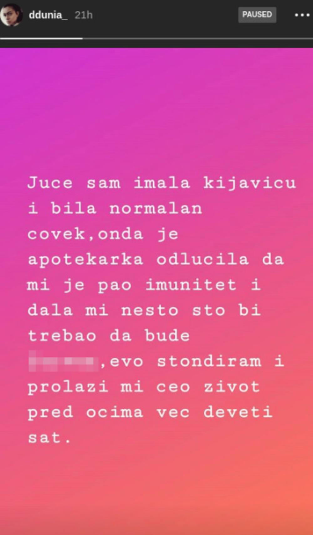 - Juče sam imala kijavicu i bila normalan čovek, onda je apotekarka odlučila da mi je pao imunitet i dala mi nešto što bi trebalo da bude (naziv leka), evo stondiram i prolazi mi ceo život pred očima, već deveti sat - napisala je Dunja.