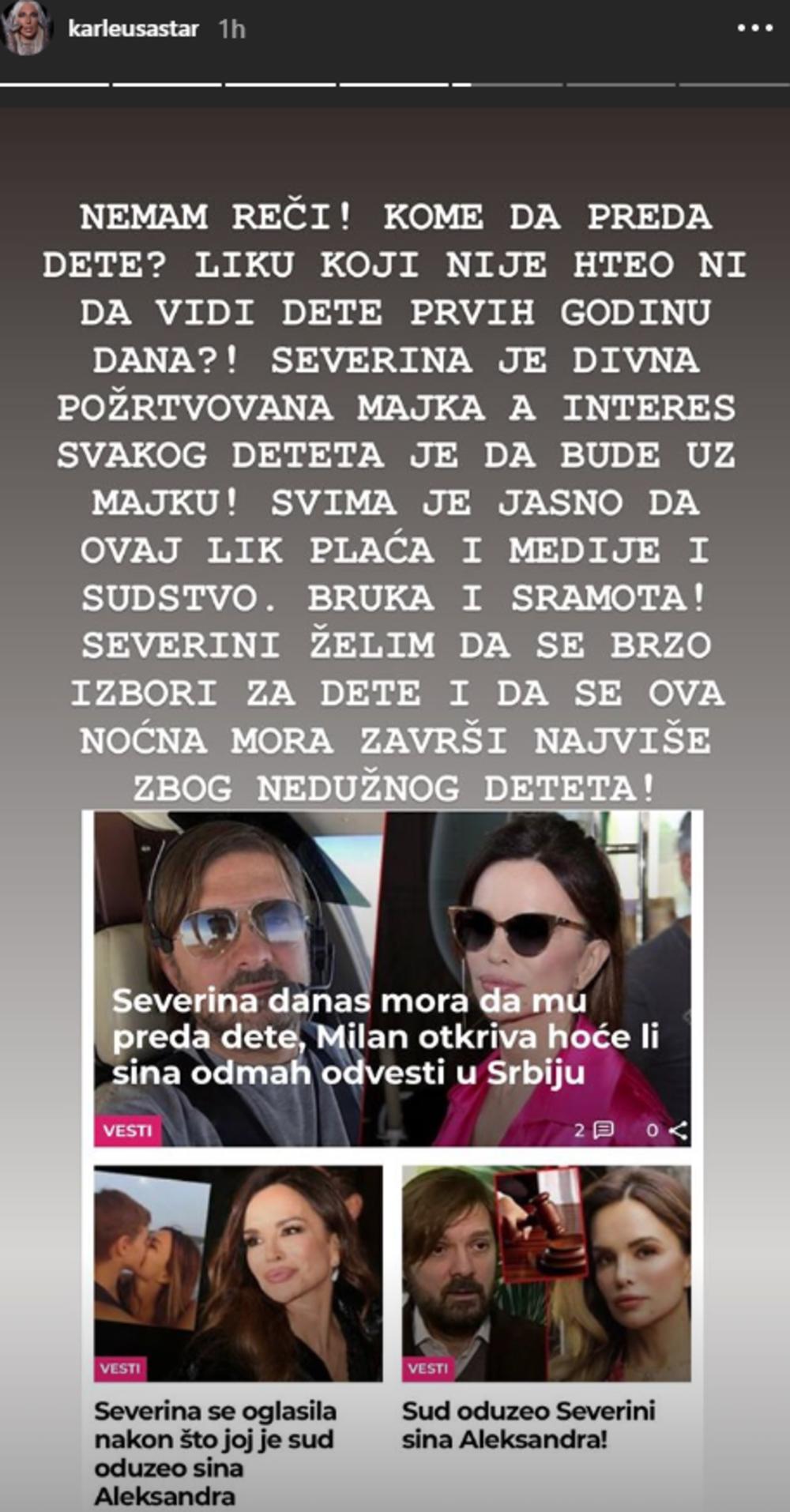 "Nemam reči! Kome da preda dete? Liku koji nije hteo ni da vidi dete prvih godinu dana?! Severina je divna majka, a interes svakog deteta je da bude uz majku! Svima je jasno da ovaj lik plaća i medije i sudstvo. Bruka i sramota! Severini želim da se brzo izbori za dete i da se ova noćna mora završi najviše zbog nedužnog deteta", napisala je pop diva na Instagramu.