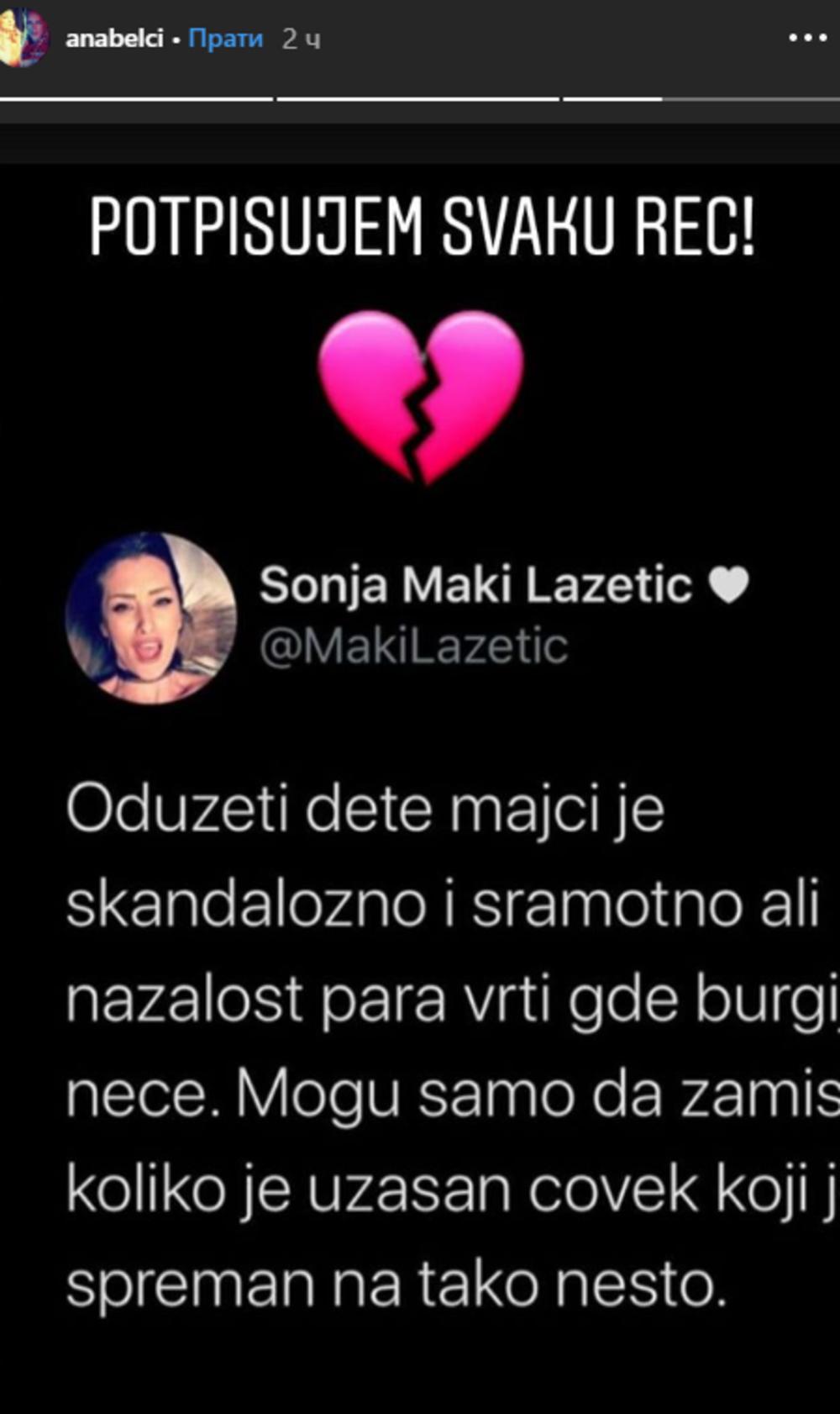 - Oduzeti dete majci je skandalozno i sramotno, ali nažalost para vrti gde burgija neće. Mogu samo da zamislim koliko je užasan čovek koji je spreman na tako nešto - složile su se Sonja i Anabela.