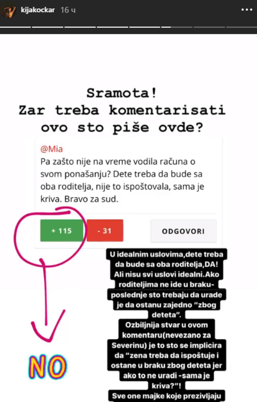 Kiju je iznervirao komentar u kom piše da je Severina sama kriva što su joj oduzeli sina. Iako nema decu, Kockareva zna šta je brak i šta znači kada roditelji nisu zajedno