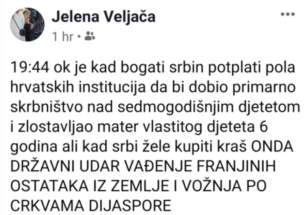 "OK je kad bogati Srbin potplati pola hrvatskih institucija da bi dobio primarno starateljstvo nad sedmogodišnjim detetom i zlostavljao majku sopstvenog deteta 6, ali kad Srbi žele da kupe Kraš, onda državni udar, vađenje Franjinih ostataka iz zemlje i vožnja po crkvama dijaspore", napisala je na ona na društvenoj mreži Fejsbuk.