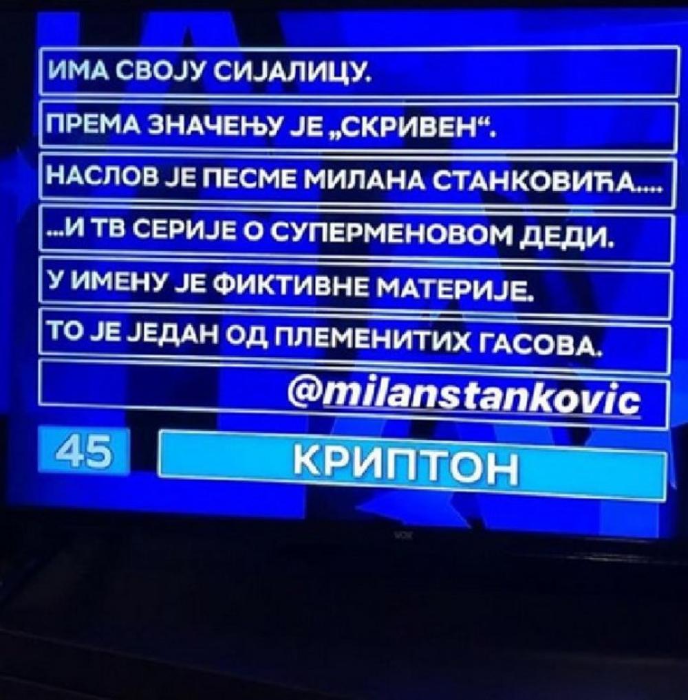 Naime, u jednoj od igara su takmičari imali zadatak da pogode pojam "kripton", a, pored drugih rečenica, na to je trebalo da ih asocira i podatak da je reč o nazivu Milanove pesme.