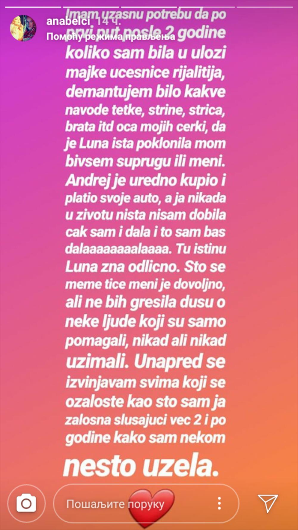 "Imam užasnu potrebu da prvi put posle dve godine koliko sam bila u ulozi majke učesnice rijalitija, demantujem bilo kakve navode tetke, strine, strica, brata i tako dalje, oca mojih ćerki, da je Luna išta poklonila mom bivšem suprugu ili meni. Andrej je uredno kupio i platio svoj auto, a ja nikada u životu ništa nisam dobila, čak sam i dala i to baš dala. Tu istinu Luna zna odlično. Što se mene tiče, meni je dovoljno, ali ne bih grešila dušu o neke ljude koji su samo pomagali, nikad, ali nikad uzimali. Unapred se izvinjavam svima koji se ožaloste kao što sam ja žalosna slušajući već dve i po godine kako sam nekom nešto uzela", napisala je Anabela.