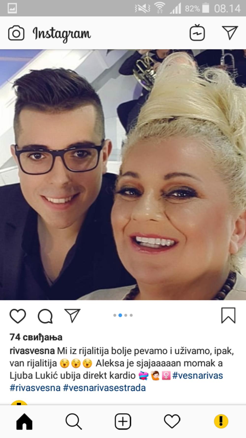 – Mi iz rijalitija bolje pevamo i uživamo, ipak, van rijalitija. Aleksa je sjajan momak, a Ljuba Lukić ubija direkt kardio - navela je Vesna Rivas uz fotografije i snimke na kojima se vidi da je do nje u tim trenucima, dok Ljuba Lukić peva na podiujmu, zapravo Stolić.