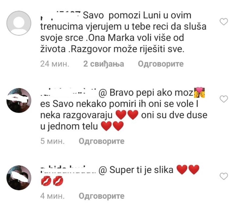 Savo, pomozi Luni u ovim trenucima, verujem u tebe, reci da sluša svoje srce. Ona Marka voli više od života. Razgovor može rešiti sve", napisao je jedan pratilac pored Perovićeve slike, a na to se nadovezala i druga obožavateljka: